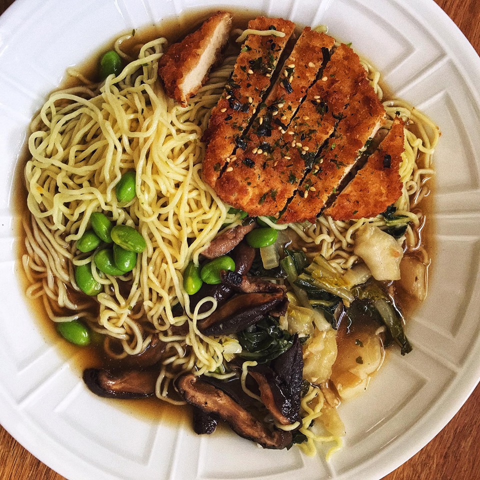 “choice of chickin’ katsu cutlet or fried tofu, shiitake mushrooms, bok choy, edamame, ginger, mushroom broth, ramen noodles, furikake”