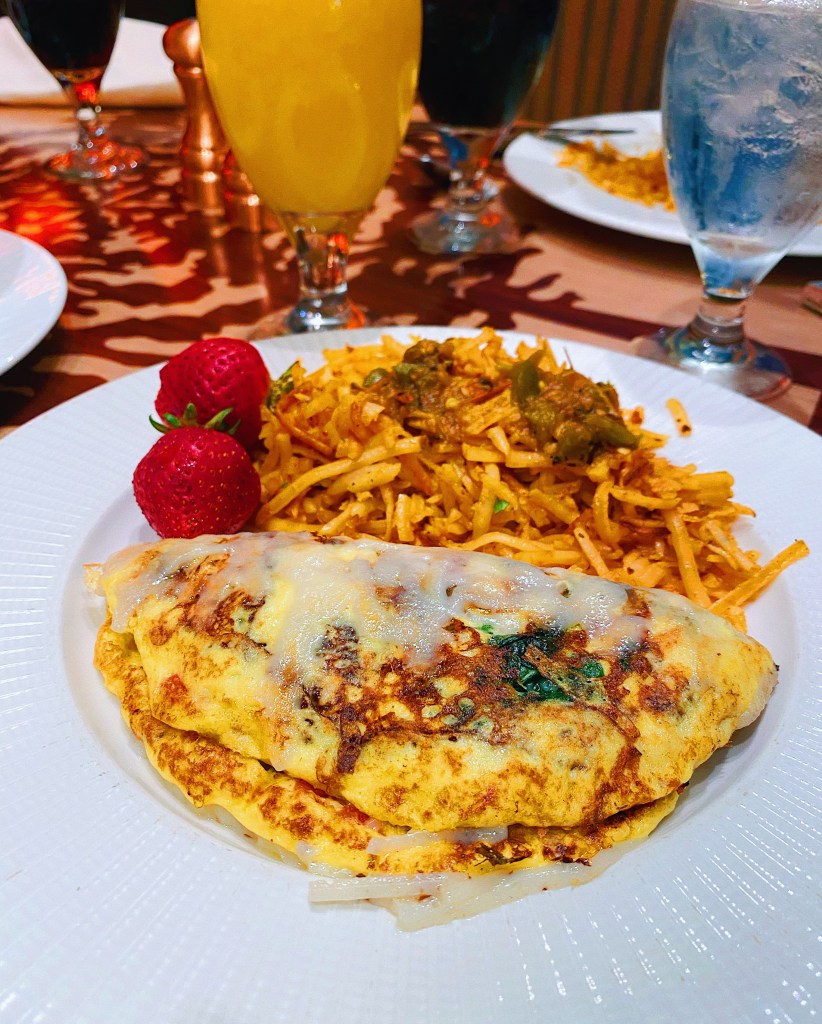 We got a text that our table was ready, and returned to Storytellers. My friend and I got birthday buttons, and were taken to our table. Beverage orders arrived, and I double checked that the server knew I am vegan – it didn’t seem like she did, but she sent the chef out a few minutes later for a consultation. He gave me a rundown of everything on the buffet that would be vegan-friendly, which included fruit, hash browns, and the omelette bar. (More on that in a moment.) He also mentioned that there are many pastries on the buffet that are vegetarian, but not vegan as they contain butter or dairy. He also offered to show me where everything is on the buffet, which I declined, but I could see that being helpful at some of the larger Disney buffets with more vegan options.