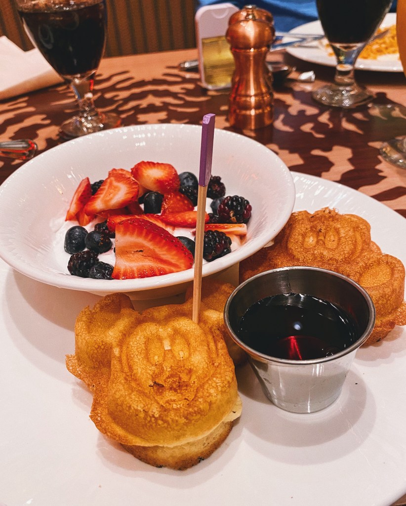 Then he gave me a rundown of what he could make for me in the kitchen, which included a fruit and coconut yogurt parfait, and allergy-friendly Mickey waffles (which are vegan and gluten-free). I ended up asking for the parfait and two waffles (note: should have ordered three). By the time I got back to the table with my buffet items, my kitchen order had arrived – and my friend had already left a Cast Compliment for our chef via the Disneyland app.